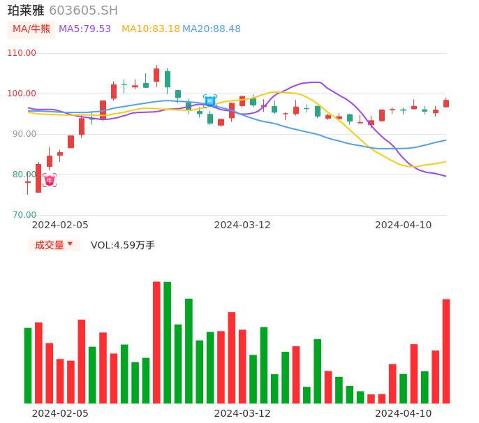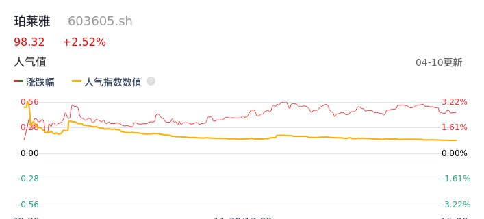 04月10日,珀莱雅收报98.32,股价涨幅2.52%,成交金额4.51亿元,换手率1.16%。