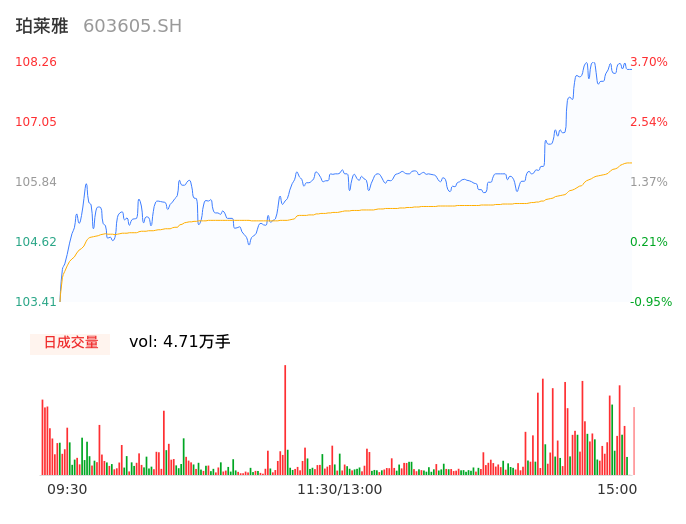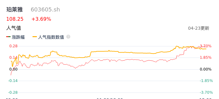 04月23日,珀莱雅收报108.25,股价涨幅3.69%,成交金额5.01亿元,换手率1.19%。