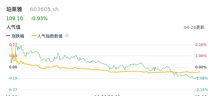 04月26日,珀莱雅收报109.10,股价涨幅-0.93%,成交金额3.03亿元,换手率0.70%。