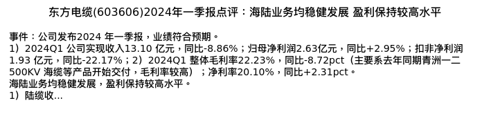 值得注意的是:2024年05月太平洋的刘强/万伟分析师,首次发布关于东方电缆的研究报告,标题为:东方电缆(603606)2024年一季报点评:海陆业务均稳健发展 盈利保持较高水平。