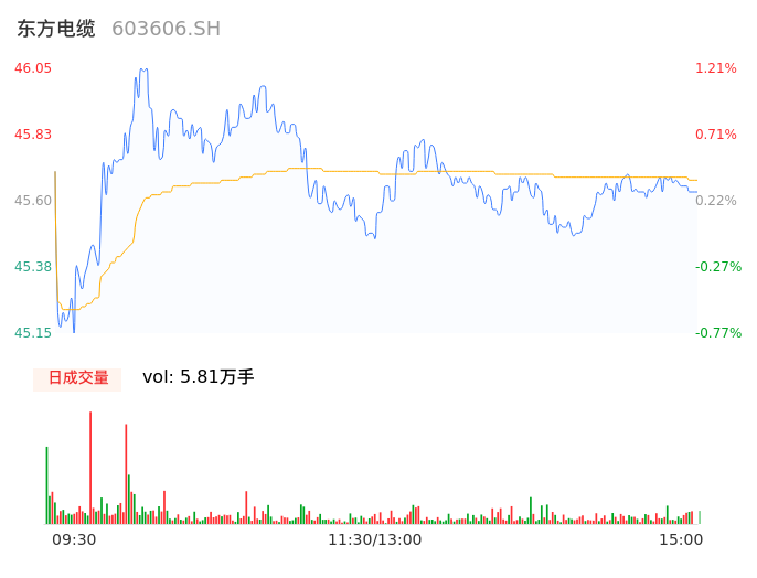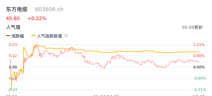 05月09日,东方电缆收报45.60,股价涨幅0.22%,成交金额2.66亿元,换手率0.85%。