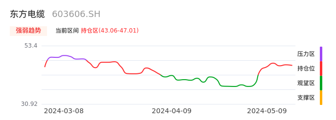 我们来看一下该股的九方特色指标强弱趋势的情况:东方电缆自04月29日从观望区上穿到持仓区。股价近期在多头区域持续强势上扬,上升动能仍较为充足,可积极关注。后续重点关注上方压力位:47.01元是否能突破上攻。