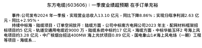 值得注意的是:2024年05月财通证券的张一弛分析师,首次发布关于东方电缆的研究报告,标题为:东方电缆(603606):一季度业绩超预期 在手订单充裕。