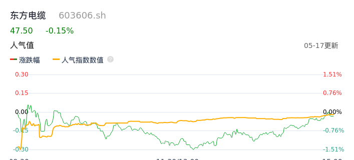 05月17日,东方电缆收报47.50,股价涨幅-0.15%,成交金额3.04亿元,换手率0.93%。