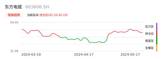 我们来看一下该股的九方特色指标强弱趋势的情况:东方电缆自05月14日从压力区回到持仓区。股价近期持续调整。后续重点关注能否站稳多空分界点:45.10元。如被有效击穿则将进入空头行情。