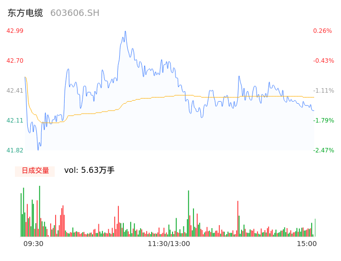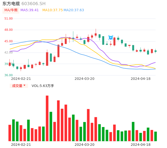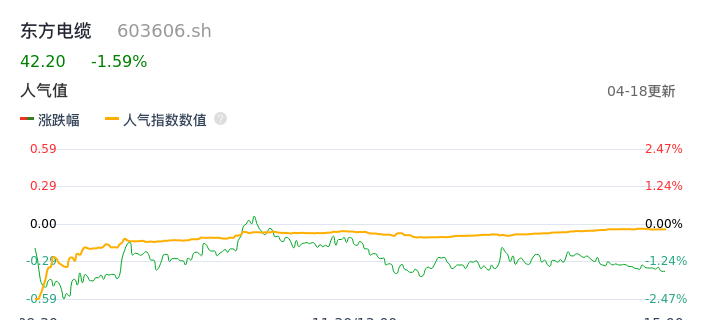 04月18日,东方电缆收报42.20,股价涨幅-1.59%,成交金额2.39亿元,换手率0.82%。