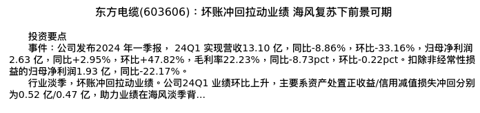 值得注意的是:2024年05月华金证券的张文臣/周涛/申文雯分析师,首次发布关于东方电缆的研究报告,标题为:东方电缆(603606):坏账冲回拉动业绩 海风复苏下前景可期。