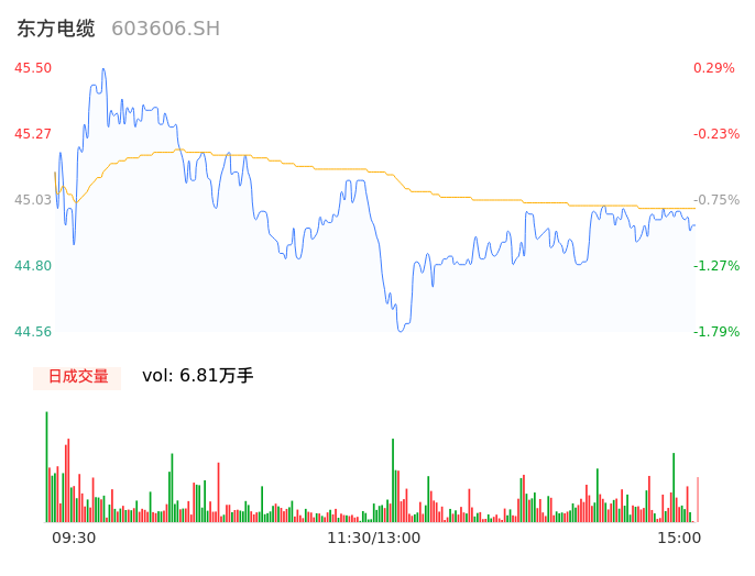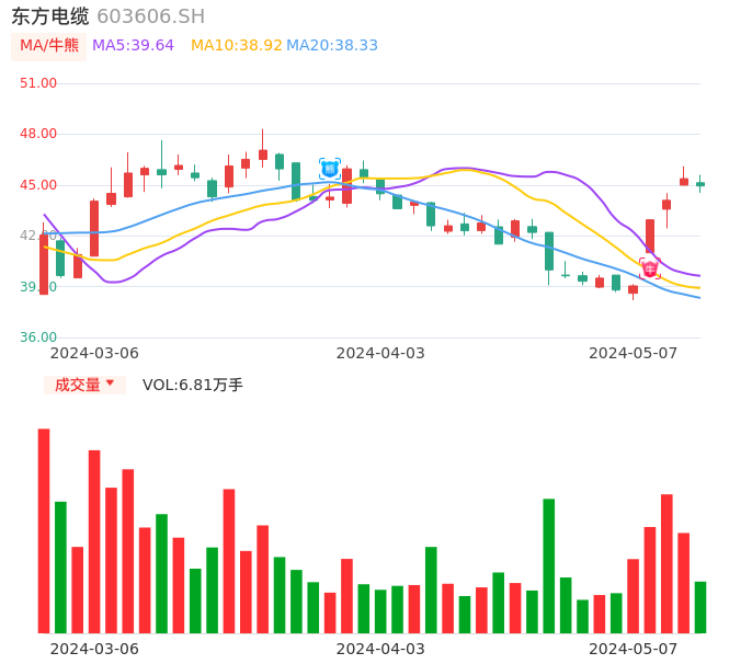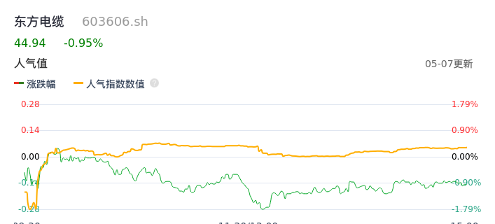 05月07日,东方电缆收报44.94,股价涨幅-0.95%,成交金额3.06亿元,换手率0.99%。