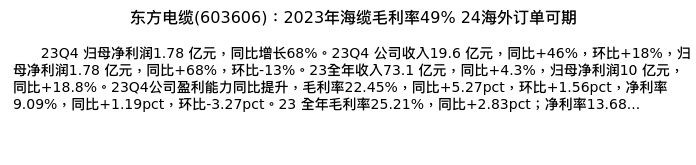 值得注意的是:2024年04月海通证券的吴杰/徐柏乔分析师,首次发布关于东方电缆的研究报告,标题为:东方电缆(603606):2023年海缆毛利率49% 24海外订单可期。