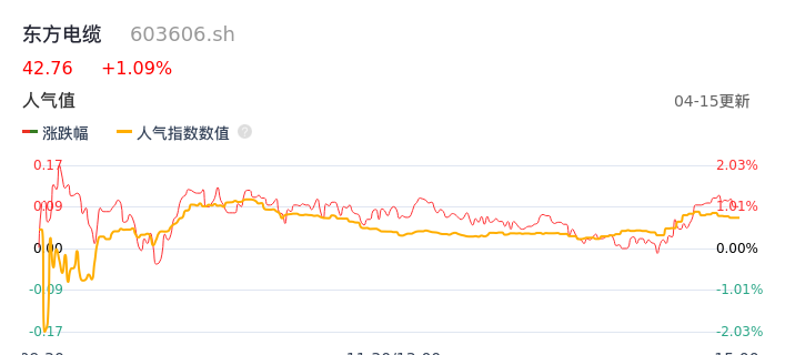 04月15日,东方电缆收报42.76,股价涨幅1.09%,成交金额2.58亿元,换手率0.88%。