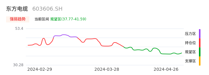 我们来看一下该股的九方特色指标强弱趋势的情况:东方电缆自04月08日从持仓区下穿到观望区。股价近期持续下跌后,短期出现止跌迹象。后续重点关注能否再次站上多空分界点:41.59元。如未能有效突破则可能进入新一轮空头行情。