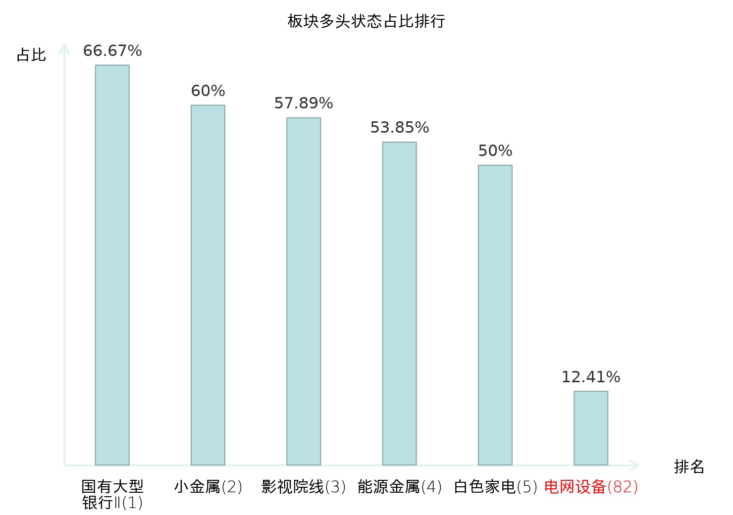 全市场所有行业板块中主力多头状态占比排名中,国有大型银行Ⅱ板块位居第一。装修装饰Ⅱ板块名次提升最快,较昨日上升48位。