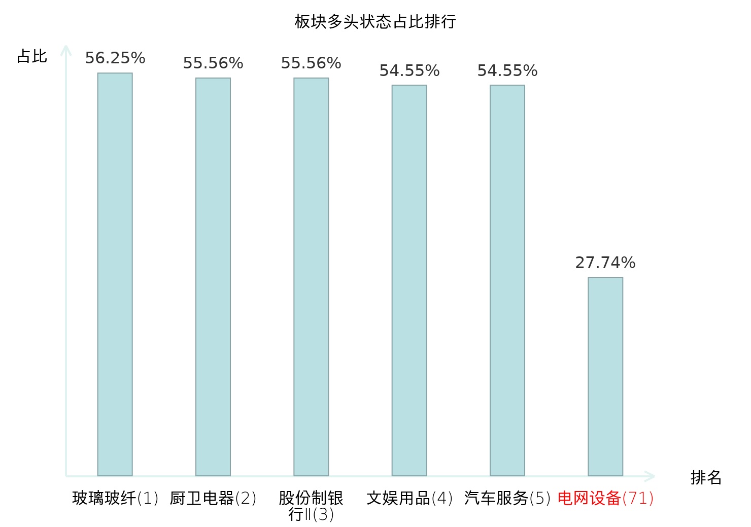 全市场所有行业板块中主力多头状态占比排名中,玻璃玻纤板块位居第一。航天装备Ⅱ板块名次提升最快,较昨日上升84位。