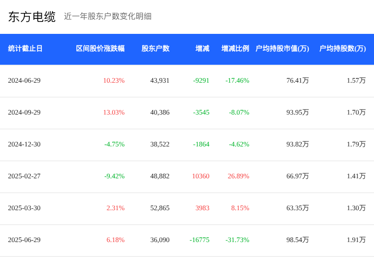 截至2025年6月30日,东方电缆(603606)的股东户数为3.61万户,较2025年3月31日环比减少31.73%。户均持股数量为46.48股,户均持股市值为98.54万元,环比增长55.53%。