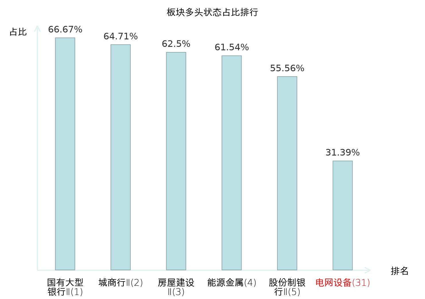 全市场所有行业板块中主力多头状态占比排名中,国有大型银行Ⅱ板块位居第一。普钢板块名次提升最快,较昨日上升65位。
