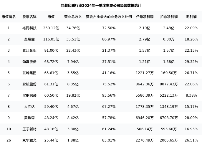 京华激光最新报告期数据为一季度,下表汇总了包装印刷行业内市值靠前的公司一季度主要经营数据