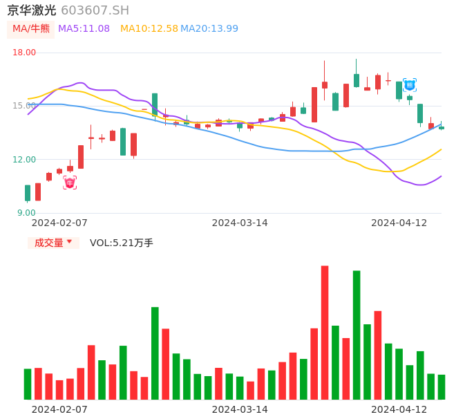 04月12日,京华激光收报13.71,股价涨幅-2.21%,成交金额7228.84万元,换手率2.92%。