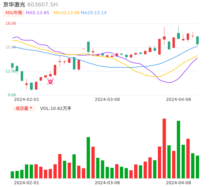04月08日,京华激光收报15.40,股价涨幅-6.27%,成交金额1.65亿元,换手率5.95%。
