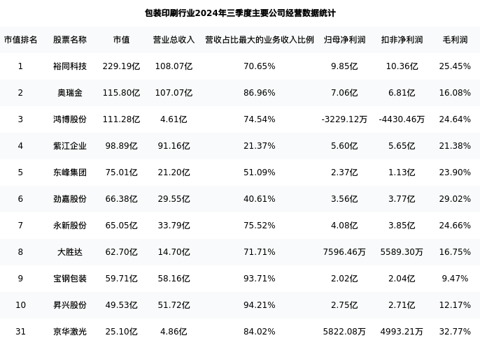 京华激光最新报告期数据为三季度,下表汇总了包装印刷行业内市值靠前的公司三季度主要经营数据