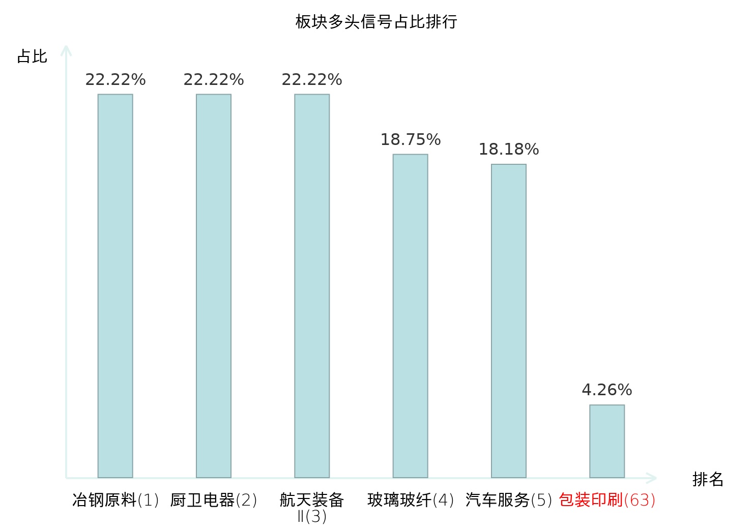 全市场所有行业板块中主力多头信号占比排名中,冶钢原料板块位居第一。航天装备Ⅱ板块名次提升最快,较昨日上升116位。