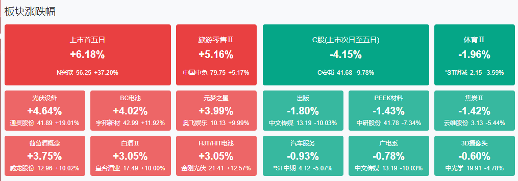 盘面上,光伏等新能源赛道股集体反弹,欧晶科技、科士达、德业股份、北玻股份等多股涨停。跨境电商概念股表现活跃,天创时尚、龙头股份、南极电商等涨停。饮料制造概念股震荡走强,威龙股份、皇台酒业涨停。短剧概念股一度冲高,元隆雅图涨停。下跌方面,PEEK材料概念股集体大跌,华密新材跌近20%。板块方面,BC电池、饮料制造、电商、短剧等板块涨幅居前,PEEK材料、汽车零部件、消费电子、航运等板块跌幅居前。