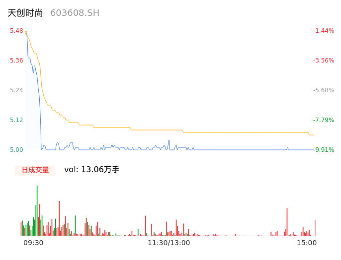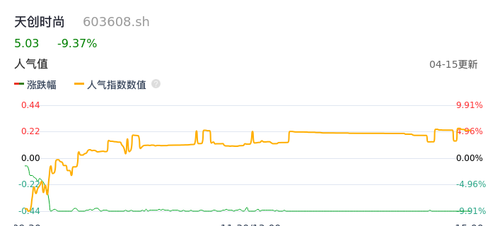 04月15日,天创时尚收报5.03,股价涨幅-9.37%,成交金额6613.73万元,换手率3.11%。
