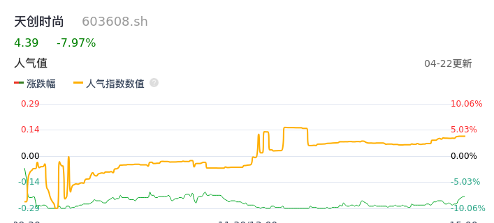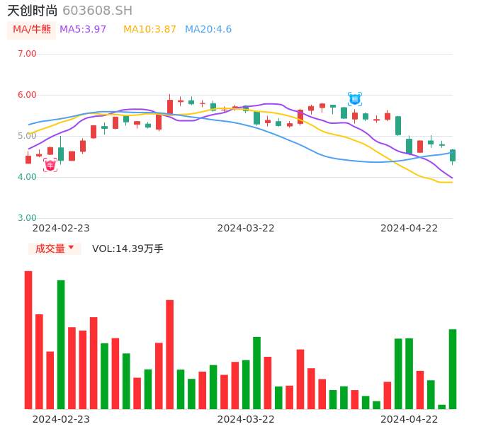 04月22日,天创时尚收报4.39,股价涨幅-7.97%,成交金额6270.50万元,换手率3.43%。