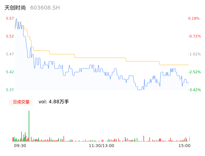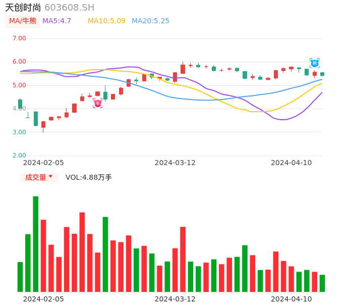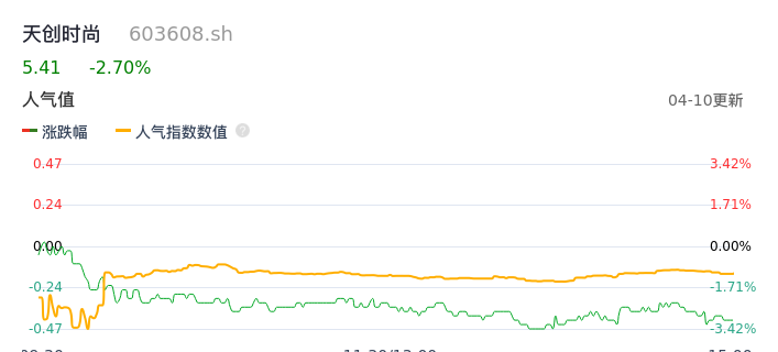 04月10日,天创时尚收报5.41,股价涨幅-2.70%,成交金额2655.25万元,换手率1.16%。