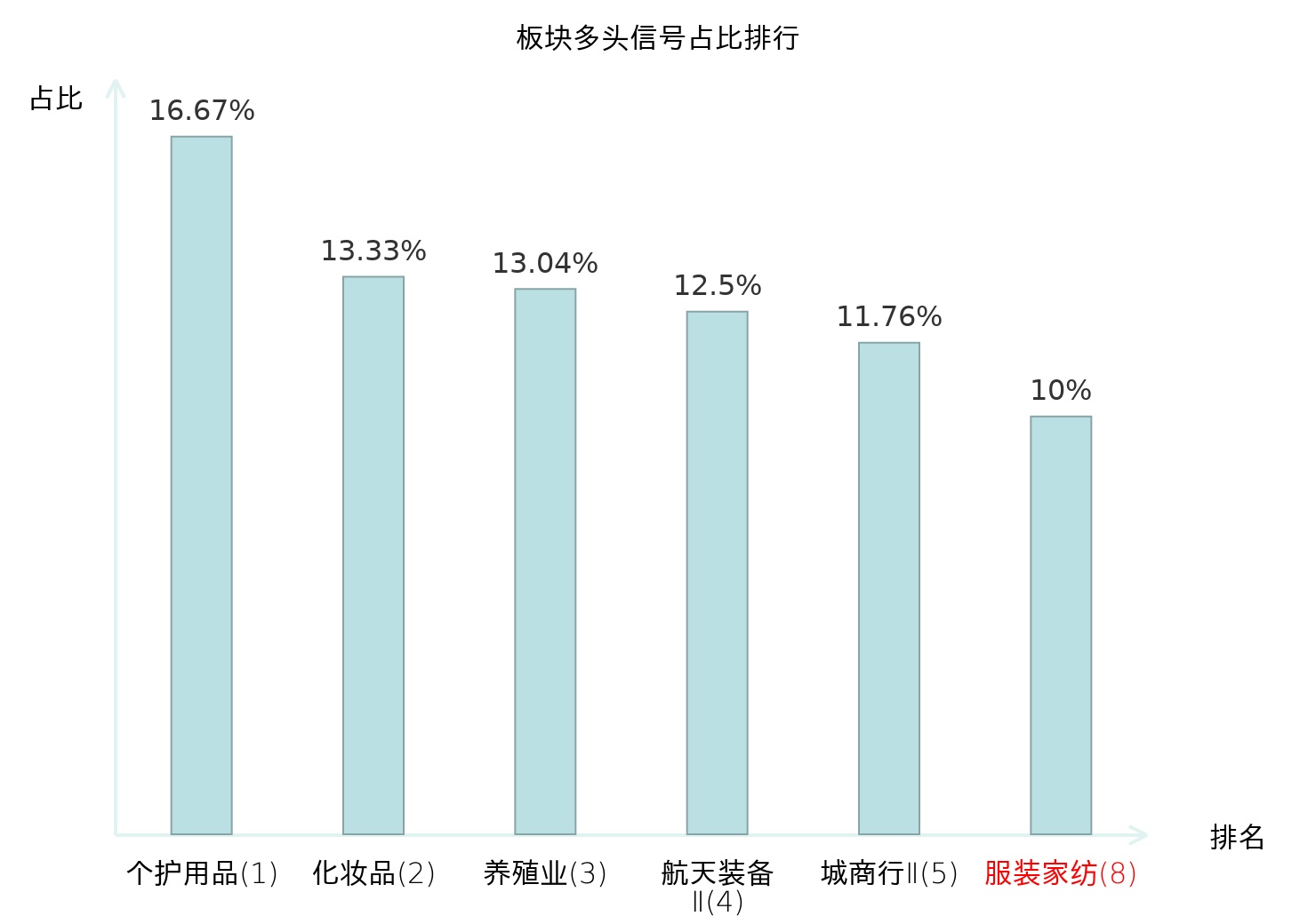 全市场所有行业板块中主力多头信号占比排名中,个护用品板块位居第一。航天装备Ⅱ板块名次提升最快,较昨日上升118位。