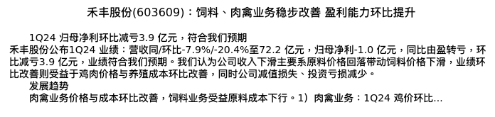 值得注意的是:2024年04月中金公司的王思洋/陈煜东/龙友琪分析师,首次发布关于禾丰股份的研究报告,标题为:禾丰股份(603609):饲料、肉禽业务稳步改善 盈利能力环比提升。