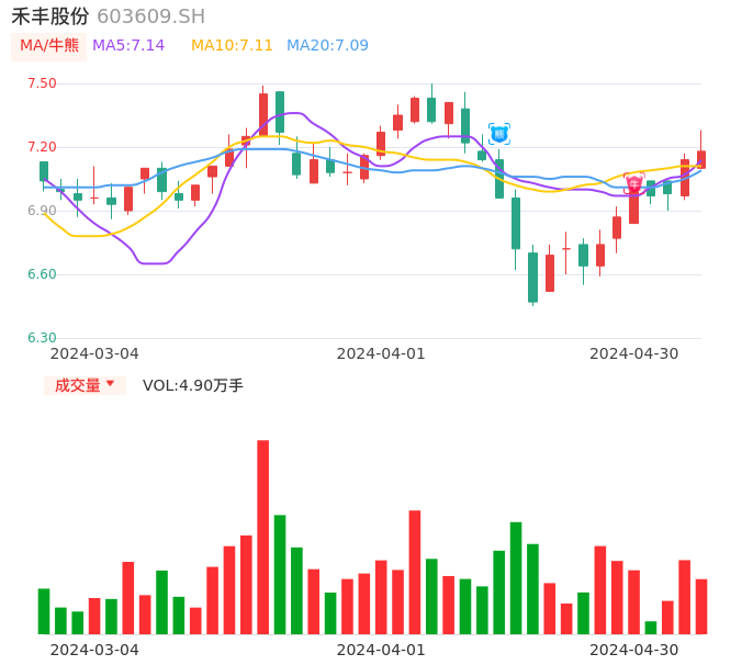 04月30日,禾丰股份收报7.18,股价涨幅0.56%,成交金额3533.43万元,换手率0.53%。