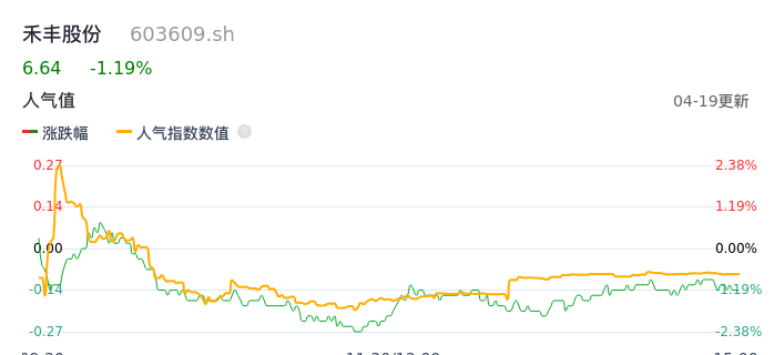 04月19日,禾丰股份收报6.64,股价涨幅-1.19%,成交金额2785.60万元,换手率0.46%。