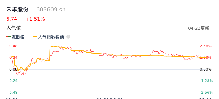 04月22日,禾丰股份收报6.74,股价涨幅1.51%,成交金额4463.76万元,换手率0.72%。
