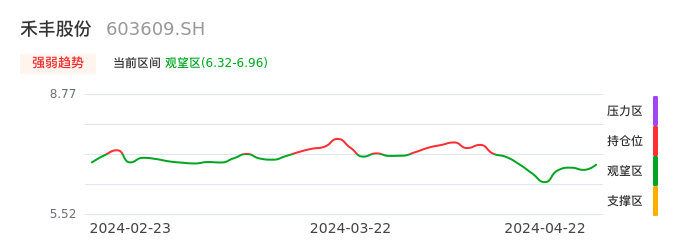 我们来看一下该股的九方特色指标强弱趋势的情况:禾丰股份自04月11日从持仓区下穿到观望区。股价近期持续下跌后,短期出现止跌迹象。后续重点关注能否再次站上多空分界点:6.96元。如未能有效突破则可能进入新一轮空头行情。