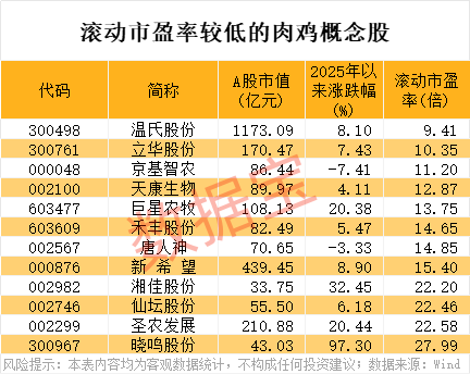 从估值水平来看,数据宝统计,截至8月11日收盘,超半数肉鸡概念股滚动市盈率不到30倍,如温氏股份、立华股份、京基智农、天康生物、巨星农牧等。温氏股份滚动市盈率为9.41倍,排在最低位置。今年前7个月,公司累计销售肉鸡7.09亿只,实现销售收入164.86亿元。