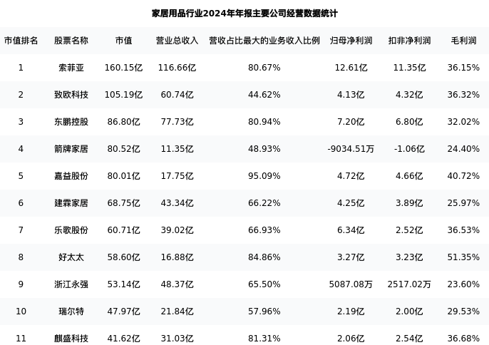 麒盛科技最新报告期数据为年报,下表汇总了家居用品行业内市值靠前的公司年报主要经营数据