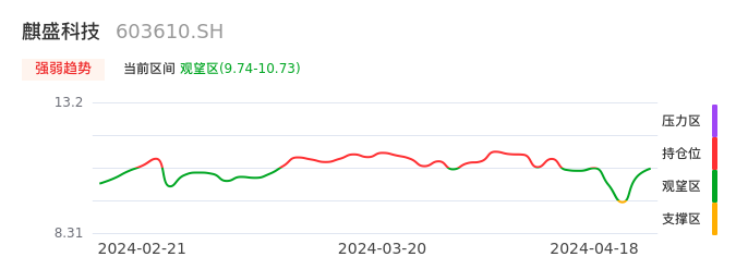 我们来看一下该股的九方特色指标强弱趋势的情况:麒盛科技近日从支撑区回到观望区。股价经过前期快速下跌后已经出现止跌迹象。下跌动能有所衰竭,股价目前处于反弹阶段,后续重点关注能否站上多空分界点:10.73元。如未能有效突破则说明弱势反弹行情结束。后续可能再次进入空头行情。