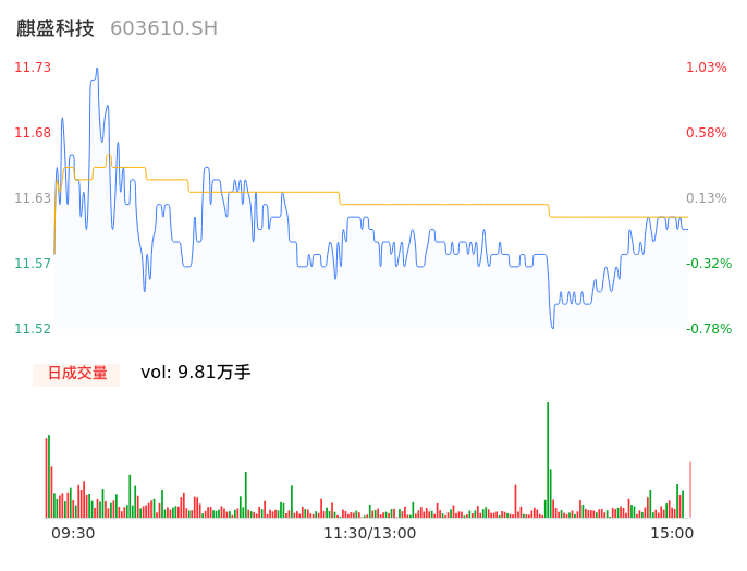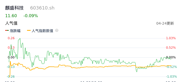 04月24日,麒盛科技收报11.60,股价涨幅-0.09%,成交金额1.14亿元,换手率2.74%。