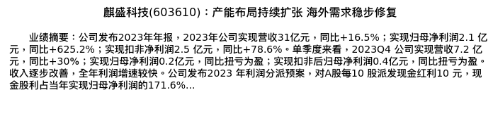 值得注意的是:2024年04月西南证券的蔡欣/赵兰亭分析师,首次发布关于麒盛科技的研究报告,标题为:麒盛科技(603610):产能布局持续扩张 海外需求稳步修复。