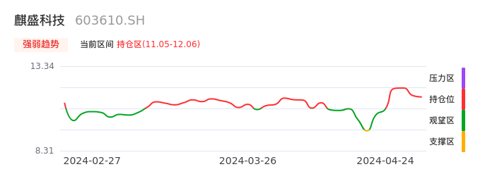 我们来看一下该股的九方特色指标强弱趋势的情况:麒盛科技自04月19日从观望区上穿到持仓区。股价近期在多头区域回调整理。后续重点关注多空分界点的争夺:11.05元。如未能有效站稳则可能重新回到空头行情。