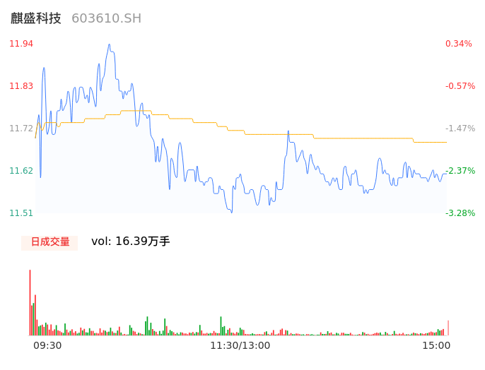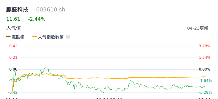 04月23日,麒盛科技收报11.61,股价涨幅-2.44%,成交金额1.92亿元,换手率4.57%。