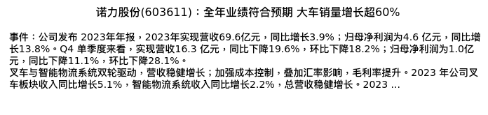 值得注意的是:2024年04月西南证券的邰桂龙/王宁分析师,首次发布关于诺力股份的研究报告,标题为:诺力股份(603611):全年业绩符合预期 大车销量增长超60%。