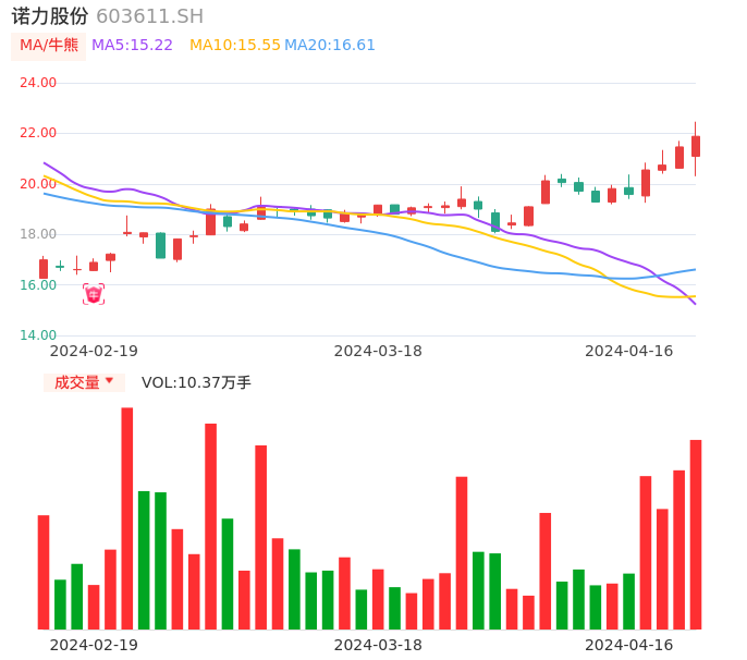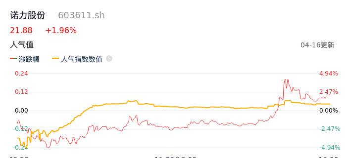 04月16日,诺力股份收报21.88,股价涨幅1.96%,成交金额2.20亿元,换手率4.03%。