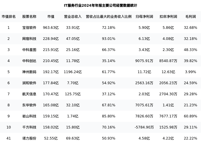 诺力股份最新报告期数据为年报,下表汇总了IT服务行业内市值靠前的公司年报主要经营数据