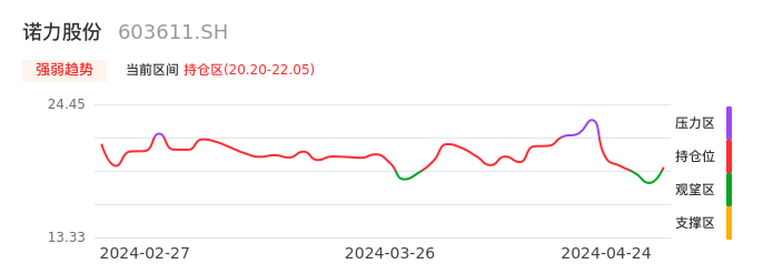 我们来看一下该股的九方特色指标强弱趋势的情况:诺力股份近日从观望区上穿到持仓区。股价短期站稳多头区域,上升动能仍较为充足,可积极关注。后续重点关注上方压力位:22.05元是否能突破上攻。