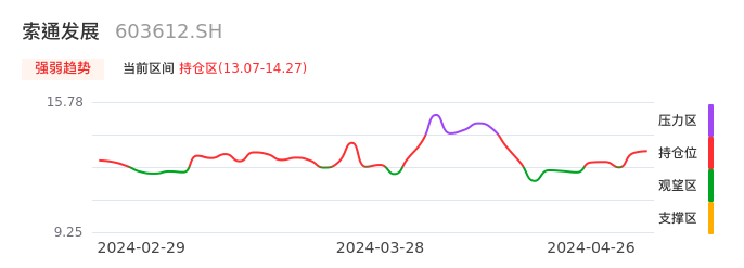 我们来看一下该股的九方特色指标强弱趋势的情况:索通发展近日从观望区上穿到持仓区。股价短期站稳多头区域,上升动能仍较为充足,可积极关注。后续重点关注上方压力位:14.27元是否能突破上攻。