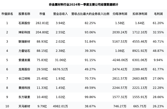 索通发展最新报告期数据为一季度,下表汇总了非金属材料行业内市值靠前的公司一季度主要经营数据
