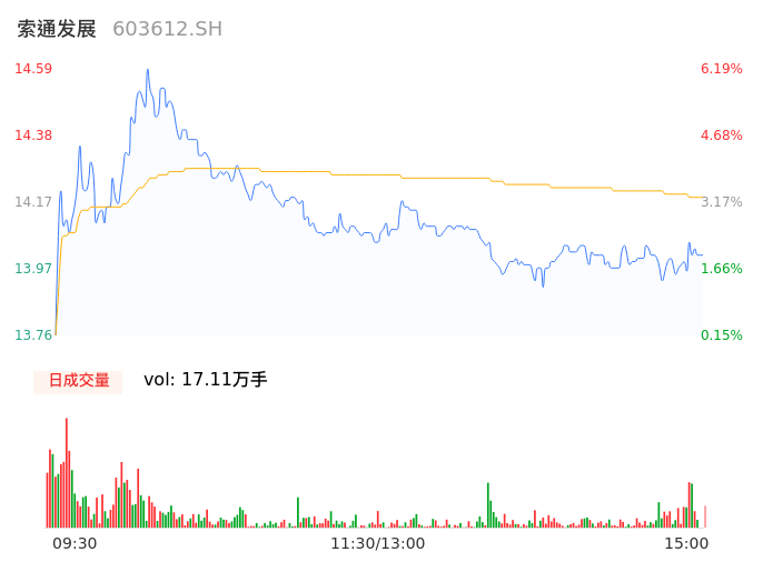 04月30日,索通发展收报14.02,股价涨幅2.04%,成交金额2.43亿元,换手率3.64%。