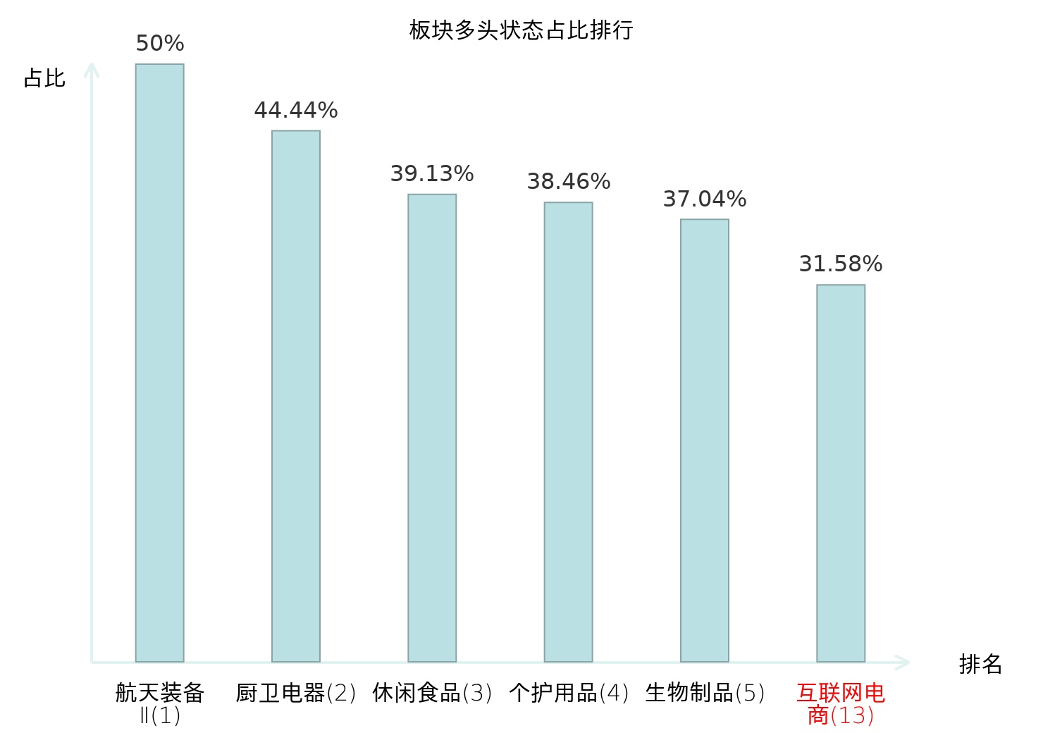 全市场所有行业板块中主力多头状态占比排名中,航天装备Ⅱ板块位居第一。小金属板块名次提升最快,较昨日上升53位。