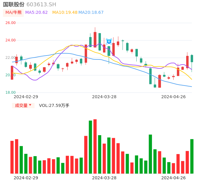 04月26日,国联股份收报21.50,股价涨幅-3.11%,成交金额5.95亿元,换手率3.82%。